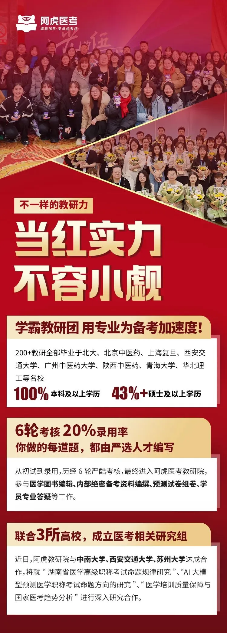 我们的教研团队有200多人,全部都是本科及以上学历,其中硕士及以上学历的占比超过43%,很多老师都毕业于北京大学、北京中医药大学、上海复旦大学这些知名院校。不仅如此,我们还和西安交通大学、中南大学、苏州大学等高校合作,成立了专门的医学考试研究中心,借助最新的AI技术和高校的科研优势,帮大家把备考的方向找得更准,让大家少花点力气,就能多拿点分数。