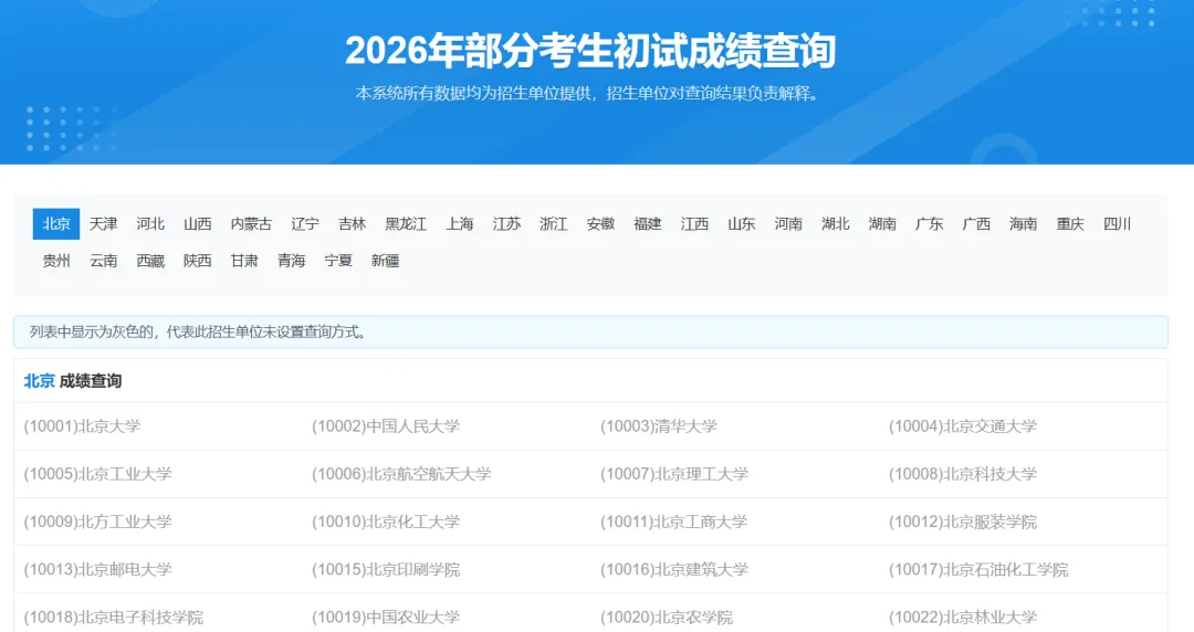 目前查询页面中,各招生单位的成绩查询入口仍显示为灰色,处于未开放状态。