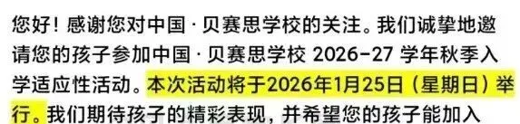 北京贝赛思2026-27学年第二场入学考试定于1月24日、25日举行。这可能是春节前最后一场入学考试,下一次可能要等到3月。