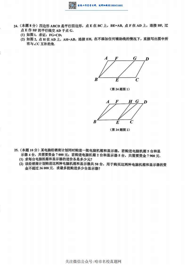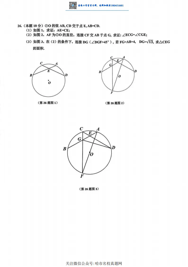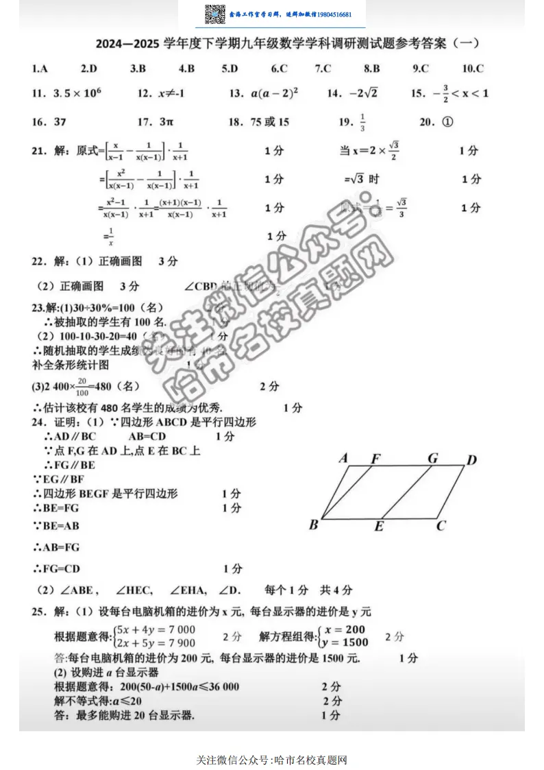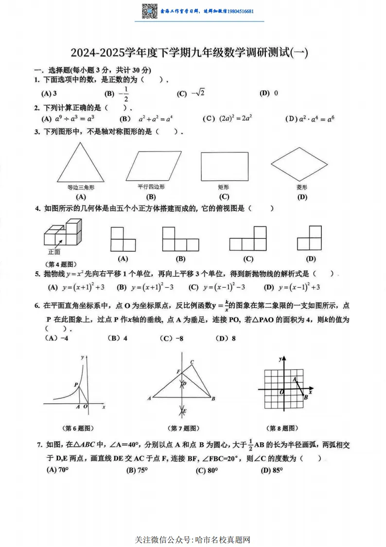 2025哈尔滨区模道里区九年级数学模拟考试 一模 试卷+答案