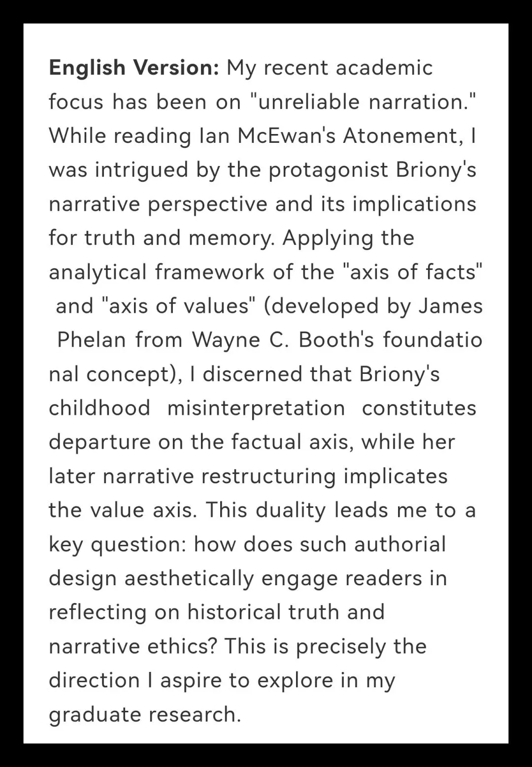 中文版本:我近期关注叙事学中的“不可靠叙述”现象。阅读伊恩·麦克尤恩的《赎罪》时,主人公布里奥妮的叙述视角引发了我对记忆与真实性的思考。我借鉴了韦恩·C·布斯的经典概念及詹姆斯·费伦发展的“事实轴/价值轴”分析框架,发现布里奥妮童年对事件的误解构成“事实轴”偏离,而其晚年为寻求救赎的叙事重塑,则涉及“价值轴”偏离。这促使我思考:作者如何通过这种双重不可靠性,引导读者反思历史真相与叙事伦理?这正是我希望在硕士阶段深化的研究方向。