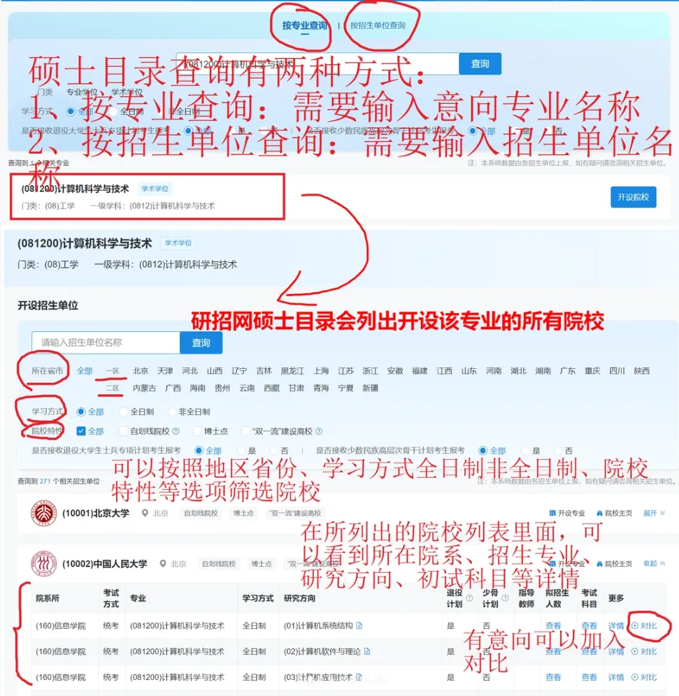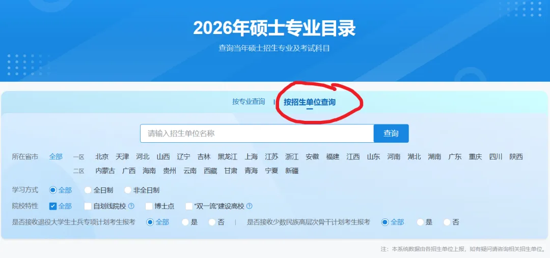 查找全国的硕士研究生招生单位,并且根据地区、学校隶属、院校特性(“双一流”建设高校、研究生院、自划线院校)可以筛选范围。