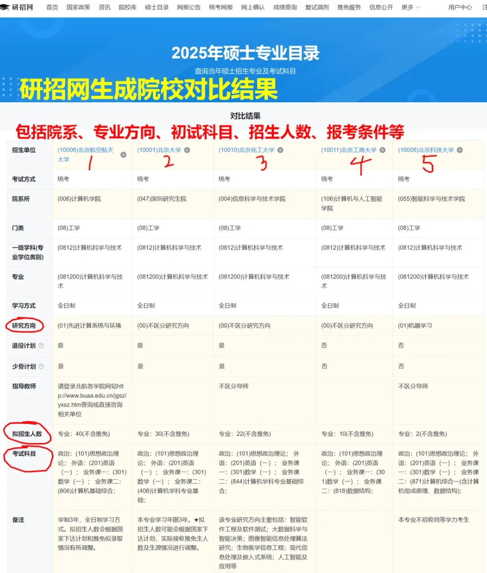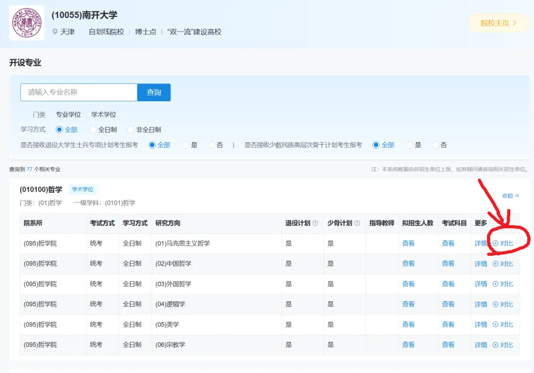 另外,研招网新增对比志愿的功能,可以将自己意向的志愿,加入对比,生成对比列表,如下图所示: