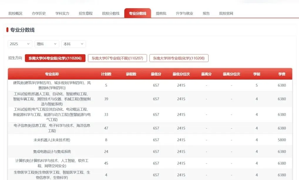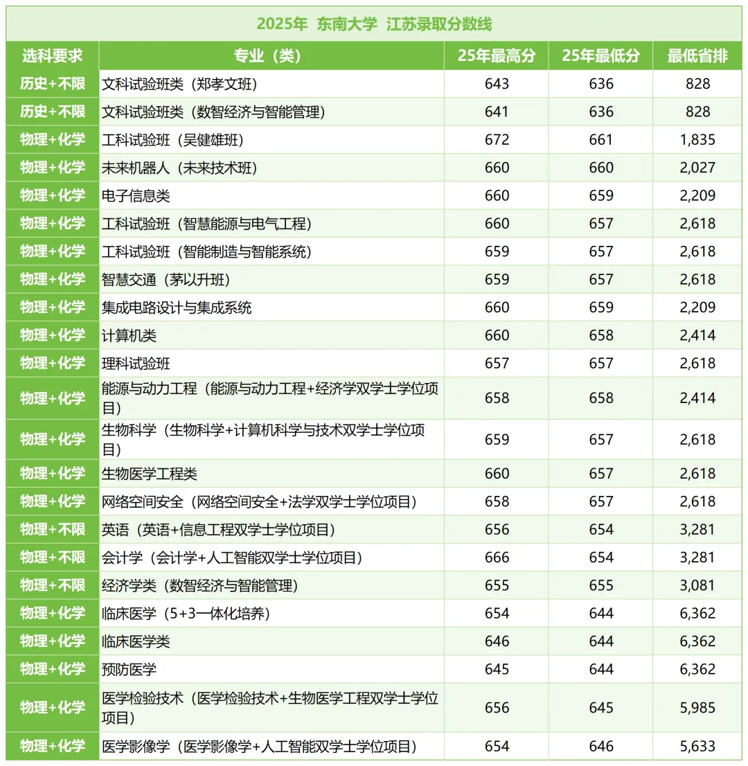 2025年东南大学在江苏录取分数线依旧较高,绝大多数理工医专业需要考生必选物理+化学;仅英语、会计学、经济学类专业要求考生为物理类即可;历史类选科要求为“历史+不限”。