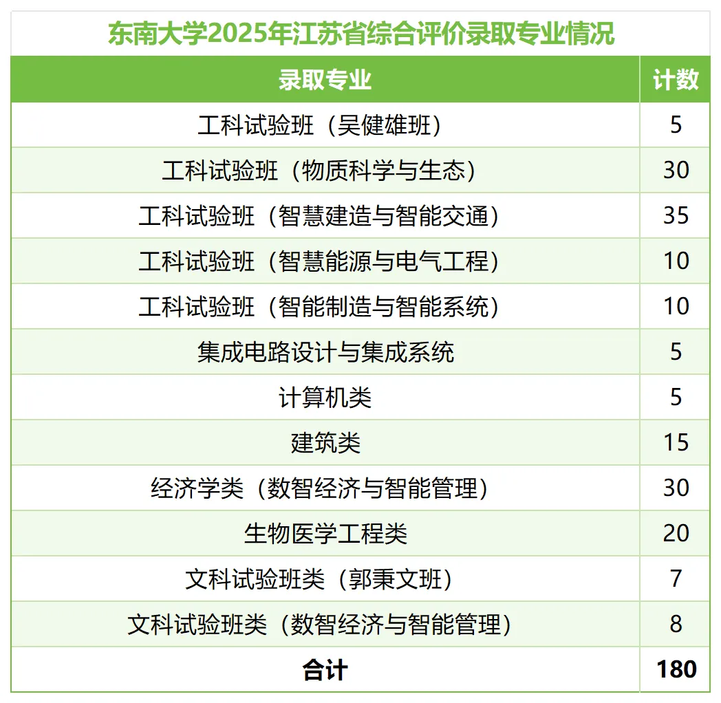 2025 年东大在江苏综合评价共录取180人,其中工科试验班(智慧建造与智能交通)招录35人,经济学类、物质科学与生态类各招录30人,是进入东大的重要途径。
