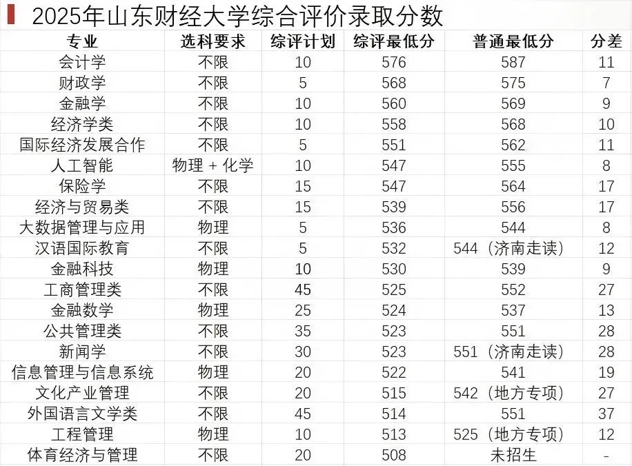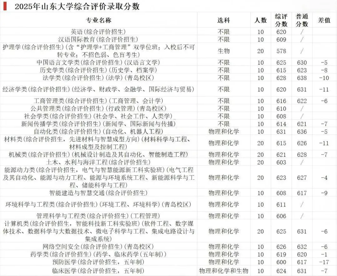 近几年来,山东大学综合评价招生的降分幅度呈现出持续下降的趋势,从前些年的降分20分,逐步调整至今年大致在上下10分的区间。具体来看,2025年降分情况中,预防医学专业降分达17分,经济学类与材料类专业的降分幅度则分别为11分,其余专业的降分基本都控制在10分以内。山东大学所采用的分组招生模式具备较高的科学性,同时,其综合评价招生的生源质量也呈现出稳步提升的良好态势。山东大学在招生专业的设置上展现出了十足的诚意,文科里面汉语言、法学、经济学、历史学。理科里面的材料、机械、能源、计算机、网络安全、临床都是目前的大热专业,同时大多数也是山大的头部专业。青岛科技大学综合评价招生的所有专业,均设置在普通类常规批次当中。从专业布局来看,无论是要求选考物理和化学的理科类专业,还是选考科目不限的文科类专业,都有一些颇具优势、值得关注的专业。在青岛科技大学的综合评价招生中,降分幅度最为显著的是两个重工科专业,其中金属材料专业降分达38分,功能材料专业降分31分。从青科的学科实力来看,其国家特色专业与省级特色专业大多集中在重工科领域,像化学工程、高分子材料与工程、材料物理、过程装备与控制工程等专业均在其列。因此,在一定程度上,高分子材料专业、过程装备专业以及化学专业,考生以510 - 520分的成绩就能被录取,性价比相当高。此外,该校的几个文科专业降分情况也较为可观,英语、工商管理、财务管理、编辑出版学等专业均有20分左右的降分。整体而言,该校各专业的降分幅度较为平稳且合理。汉语言文学、中国共产党历史、工商管理这三个专业,以及三个中外合作办学专业,均可被视为热门专业。此次山东师范大学综合评价招生的降分幅度较为平稳,平均降分约23分。该校的三个中外合作办学专业未在普通类批次招生,不过从相关数据来看,山东师范大学的财务管理(中外合作)专业录取分数为545分,物流管理(中外合作)专业录取分数为522分,这两个专业的分数均远高于其综合评价的录取分数,通过综合评价报考这两个专业,可实现约20分的降分。在热门专业中,汉语言文学专业的降分表现十分突出,取得了19分的降分。需要提醒考生和家长的是,新闻学专业虽然看似降分幅度较大,但它实际上属于“艺术类”专业,只有播音主持艺术统考成绩达到本科线的考生才有资格报考。