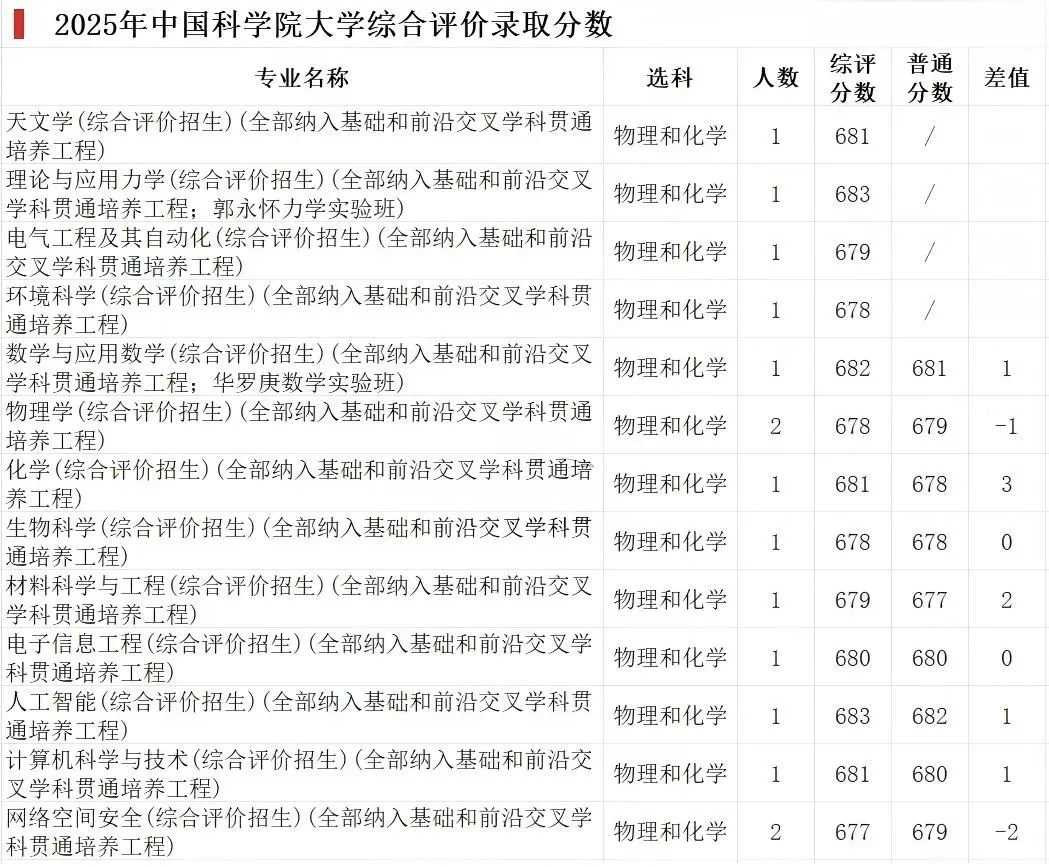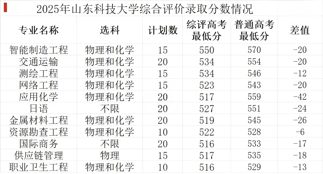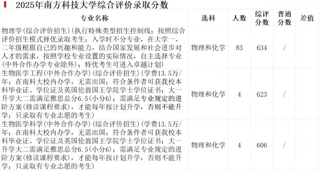 华南理工大学作为综评中为数不多的985院校,目前这几年综评申请热度非常稳定,其所抛出的专业强度较高。本次依然是未能在普通类中找到很多的参考分数,但其招生最低分为627分,且专业比较贴近土木方向。换句话来说,以上专业中除了智能制造工程外应该不会再有更差的专业,所以其综合降分可以达到至少15分以上的水平!南方科技大学的录取分数处于较为理想的水平,其中唯一在普通类批次招生的专业——人工智能专业,录取分数为647分。相较而言,通过综合评价招生,该专业大概有10分左右的降分优惠。需要注意的是,生物医学工程和生物医学科学这两个专业为中外合作办学专业,学费每年高达13.5万元。中石油本次均值降分为9分,并且其开设专业类型是所有的综合评价院校里面最全的院校。全部专业都能在普通类中找到对应的分数。其国家特色专业:资源勘查、石油工程、应用化学、油气、过程装备与控制工程等省一流专业:材料、计算机科学与技术、电气等多达十几个学校王牌专业均在综评内招生。其中降分最大的专业为测绘工程,降分18分。其中地球物理学、资源勘查工程、安全工程降分均超过15分。海洋油气、石油工程、应用化学表现也非常不错都有10分以上的降分水平。其中管理科学与工程类并未降分。这里大家要区分清楚中国科学院大学和中国科学技术大学的区别。前者简称国科大、后者则是中科大。在第四轮学科评估中,中科大有 7 个 A + 学科,包括物理学、化学、地球物理学等,在量子通信等技术创新领域表现卓越。国科大拥有 18 个 A + 学科。因为在历史发展中,中国科学院大学主要以培养研究生为主,自2014年才开始招收少量本科生。所以其虽然不是985、也不是211院校。但依然无法撼动其科研第一所的地位,可以明显看到其综评的录取中出现了罕见的分数倒挂情况。但分数基本与普通类持平。其中化学、数学、材料、人工智能、计算机均出现了1~3分分数倒挂,即综评分数高于普通分数。今年山东科技大学在综合评价招生中的降分情况整体趋于平稳,与去年相比波动减小。去年录取分数较低的日语专业,今年分数有显著回升。在此次降分中,表现最为突出的是应用化学专业,降分幅度高达42分,如此大的降分幅度下,无论复试成绩如何,考生几乎不会出现分数倒挂而被录取的情况。