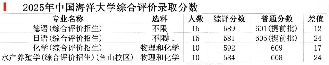 中国海洋大学按其实力与地位,报考热度本不应如此低迷。关键原因在于其招生专业设置较为单一,仅涵盖两个小语种专业以及化学、水产专业。不可否认,化学和水产均为该校的王牌专业,其中化学专业设有海洋化学这一特色培养方向,感兴趣的同学可自行深入了解。由于小语种专业不在普通类批次招生,特此找了两个相关参考数据。整体来看,综合评价招生可降分约20分。在此,强烈建议对化学感兴趣的同学查看海洋化学方向的详细资料。浙江大学作为顶尖的985高校,在综合评价招生中能为考生提供20分的降分优惠。不过,大家务必留意括号内的关键信息,其招收的专业均为中外合作办学专业。这5个专业每年的学费统一为16万元。另外要特别提醒,表格里所采用的参考分数是普通类专业的分数,这一点大家一定要格外留意!深圳北理莫斯科大学作为综合评价中外合作院校中常被视作保底选择的院校,其录取分数表现稳定,分数大致维持在525分至550分之间。该校初审条件相对宽松,因而成为众多考生的首选报考院校。目前,该校在普通类批次中招收的4个专业,录取分数均超过550分。据预估,通过综合评价招生途径,考生可获得约10分至20分的降分优惠。根据2025年最新公布的招生计划,该校学费标准为每年70000元。上海科技大学的情况较为特别,它虽采用综合评价的招生模式,但在志愿填报环节,需在提前批A的其他类中进行填报。尽管上海科技大学与上海纽约大学同属综合评价类院校,但二者存在显著差异。上海科技大学是公办院校,学费按照正常标准收取,每学年6000元;而上海纽约大学属于中外合作办学性质,四年学费总计高达100万元左右。学费差异这一因素,在一定程度上致使上海科技大学的录取分数相对较高。版权声明:本文来源于山东升学规划一点通、高中备考指南和网络汇总。以上图文贵在分享。如有侵权请联系删除。转发请备注来源