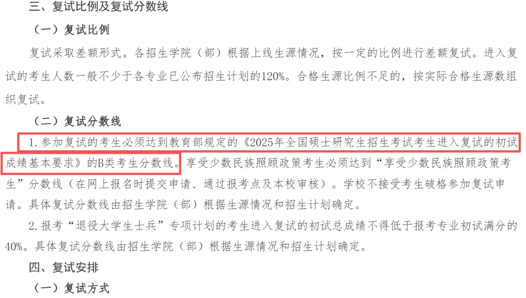 《湖北民族大学2025年硕士研究生招生复试录取工作方案》明确写道:参加复试的考生必须达到教育部规定的《2025年全国硕士研究生招生考试考生进入复试的初试成绩基本要求》的B类考生分数线。