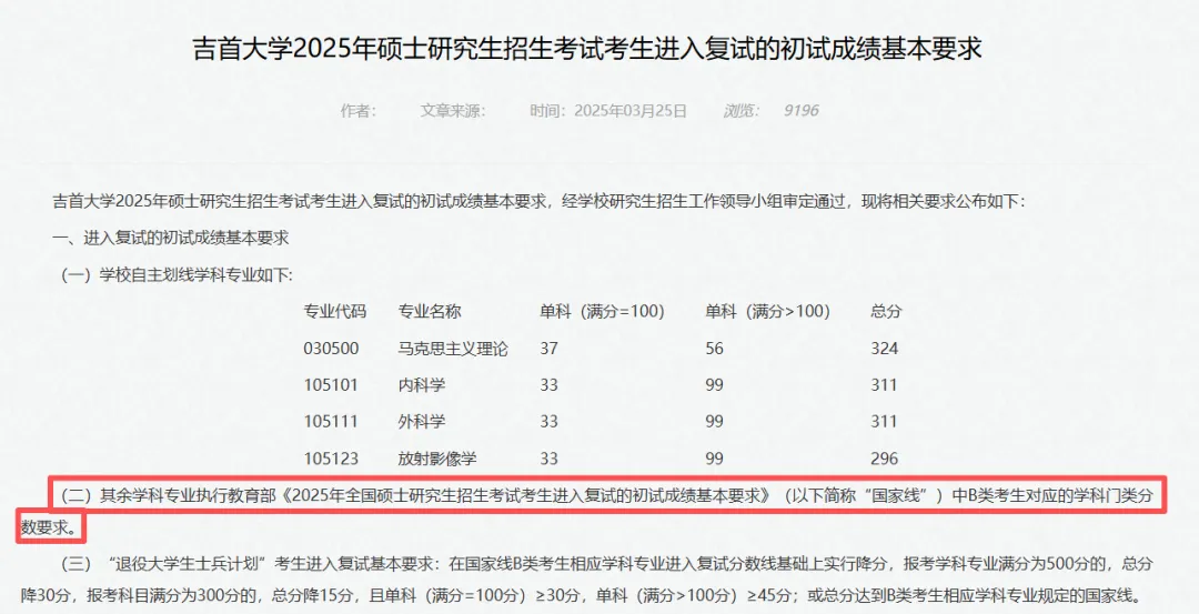 《吉首大学2025年硕士研究生复试录取工作方案》明确写到:其余学科专业执行教育部《2025年全国硕士研究生招生考试考生进入复试的初试成绩基本要求》(以下简称“国家线”)中B类考生对应的学科门类分数要求。