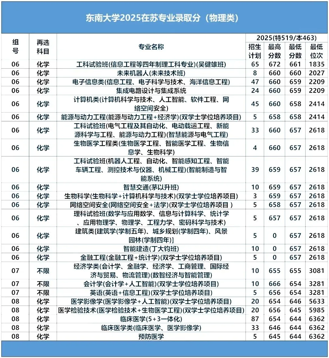 物理类录取分最高的专业是工科试验班(信息工程等四年制理工科专业)(吴健雄班),672分;录取分最低的专业是临床医学(5+3一体化)、临床医学类(临床医学、医学影像学)、预防医学,644分。