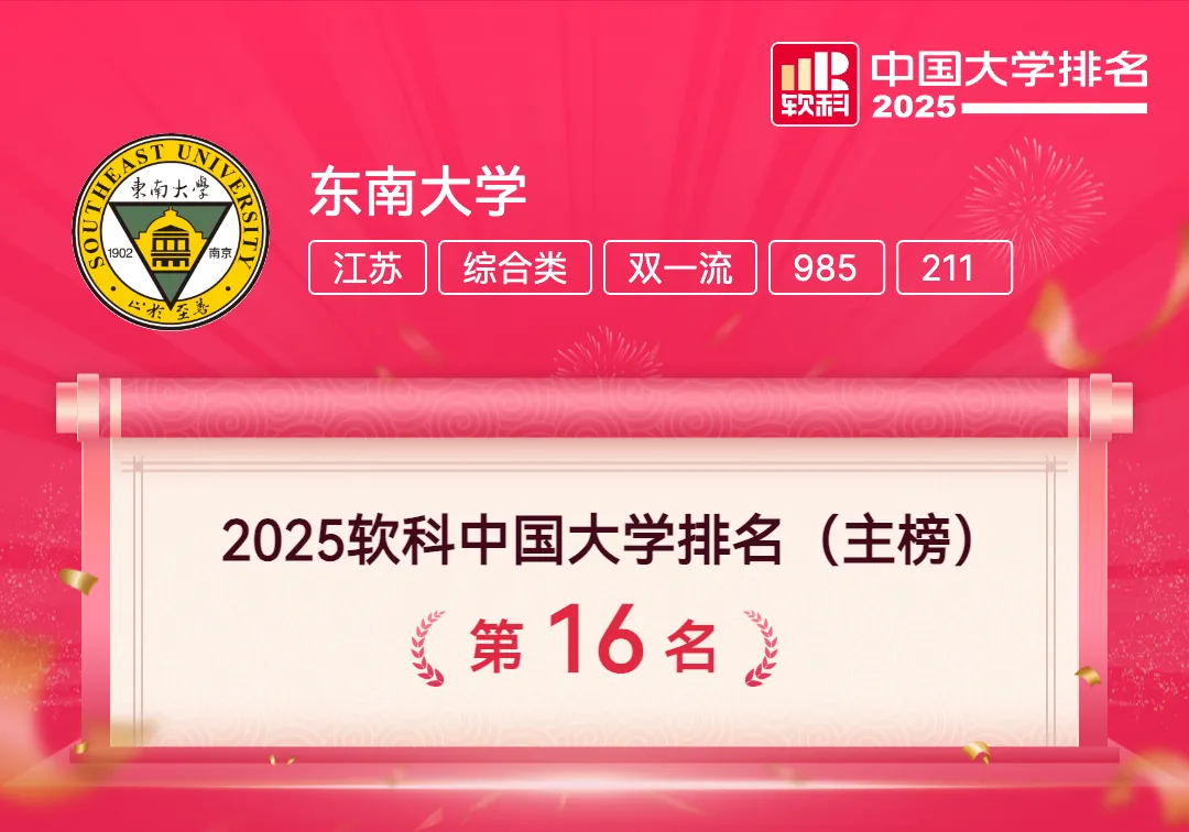 2025软科中国大学专业排名中,东南上榜27个A+专业,其中城市地下空间工程、道路桥梁与渡河工程、电子科学技术、工程管理、海洋信息工程、建筑学、交通工程、生物医学工程、物流管理、信息工程均排名第1。