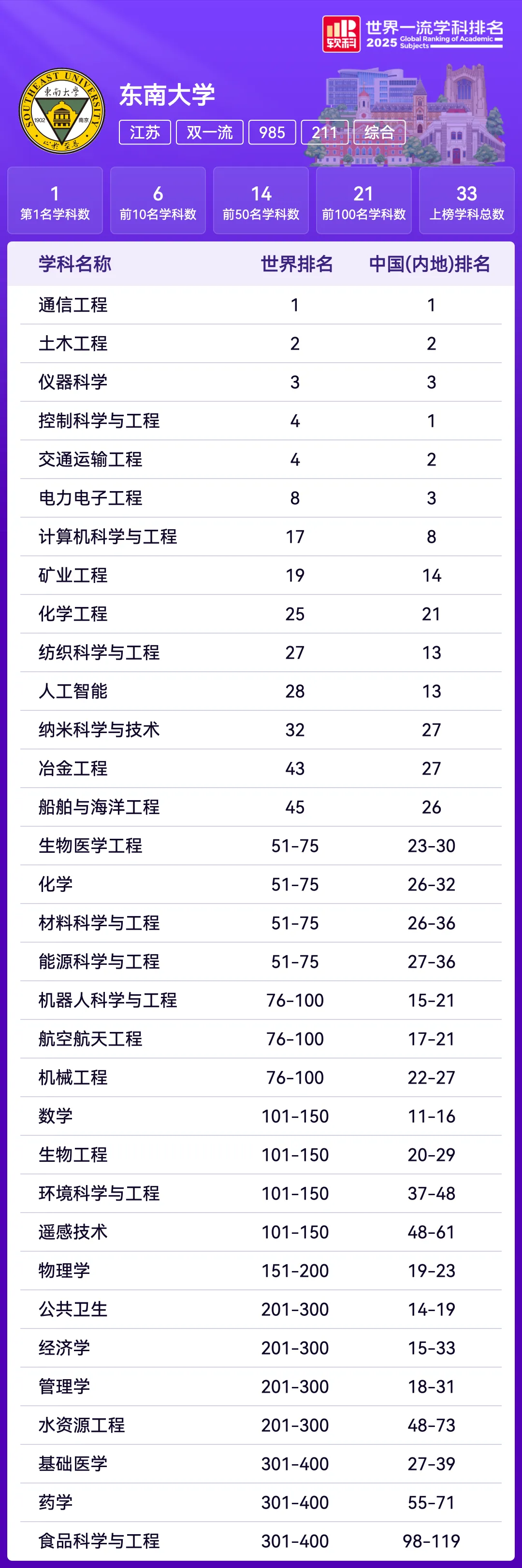 2025软科世界一流学科排名中,东南大学上榜22个学科,其中通信工程排名世界第1。