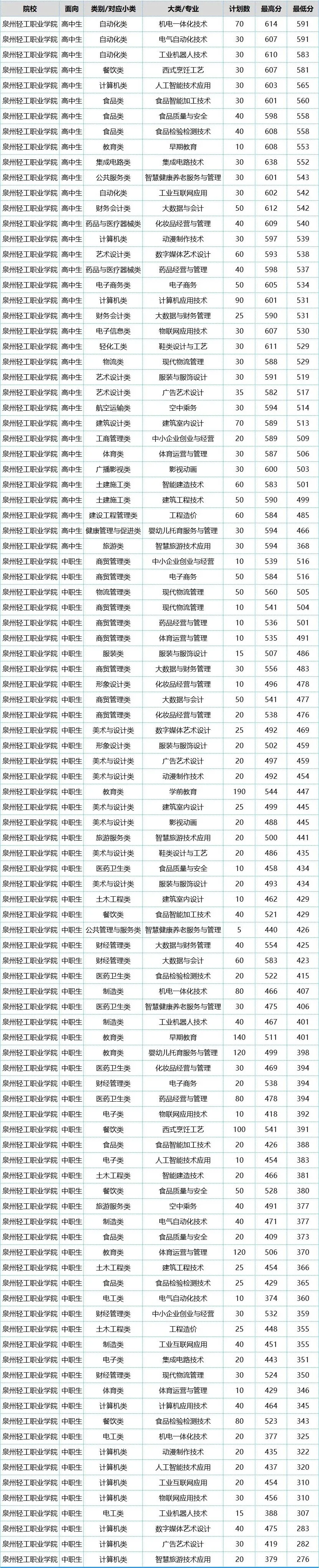 泉州轻工职业学院位于海上丝绸之路起点、中国品牌之都—福建·晋江,由晋江市委、市政府主导,澳门金龙集团和福建恒安集团、安踏集团、浔兴集团、艾派集团五大知名企业共同创办,2006年4月开始筹建,2009年秋季正式招生办学,是福建省示范校、“双高校”。学校设有智慧制造学院、食品药品工程学院、教育与健康生活学院、服务经济学院、文创学院、建筑学院、数字技术学院7个二级学院和马克思主义学院,依托产业开设食品、鞋服、机电、工业机器人、物联网、人工智能、集成电路、建筑、电商物流、财管会计、动漫、影视动画、学前教育、体管等专业,其中国家级骨干专业3个、国家级协同创新中心1个、国家级生产性实训基地1个、国家级专业教学资源库2个,省级产业学院5个、省级服务产业特色专业群3个、省级高水平专业群2个、省级产教融合示范专业1个、省级专业教学资源库1个、省级示范性职教集团1个、省级特色专业群实训基地3个、省级虚拟仿真实训基地2个、省级高水平专业化产教融合实训基地1个等,在2023年ABC中国高职院校排名中,位列民办高职院校全国第10位、福建省第1位,综合实力位列福建省高职院校第一阵营、全国民办高职院校第一阵营。