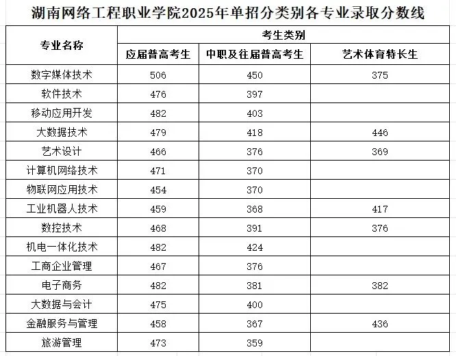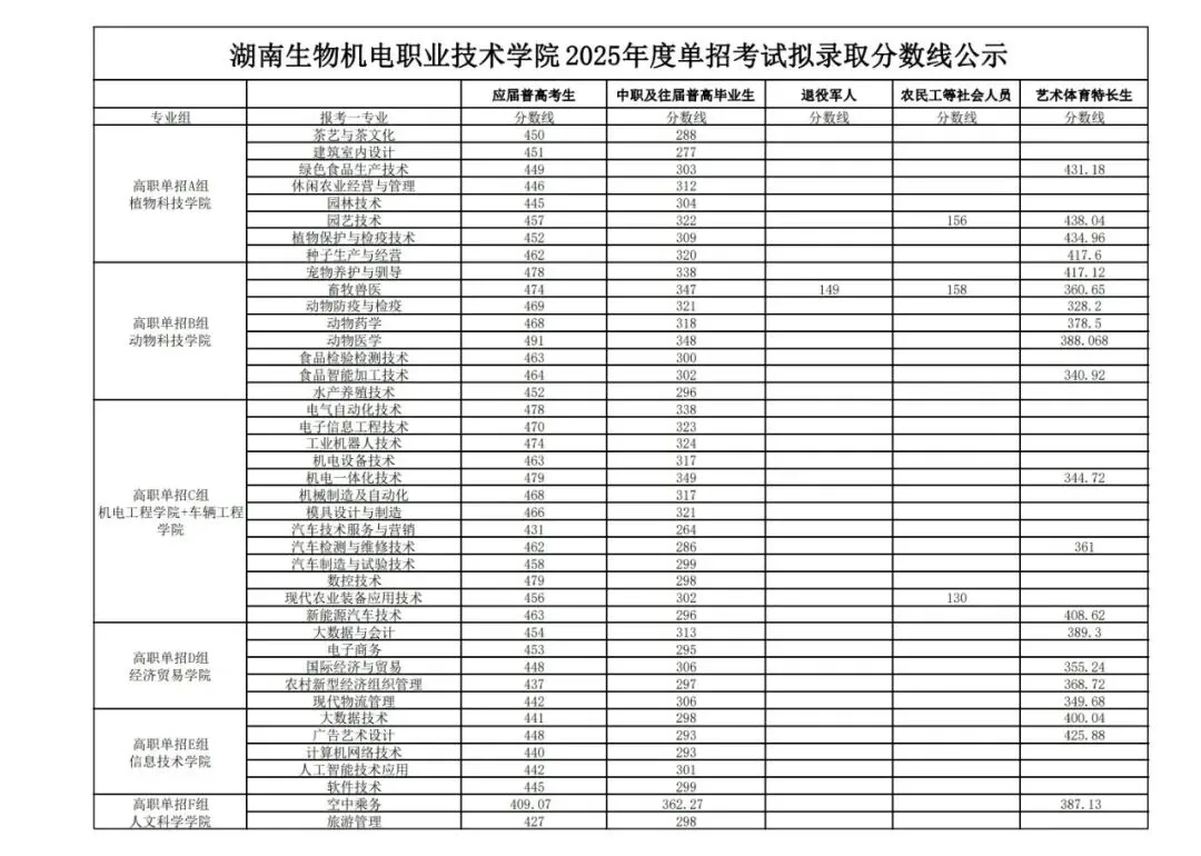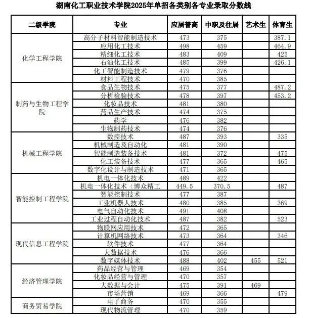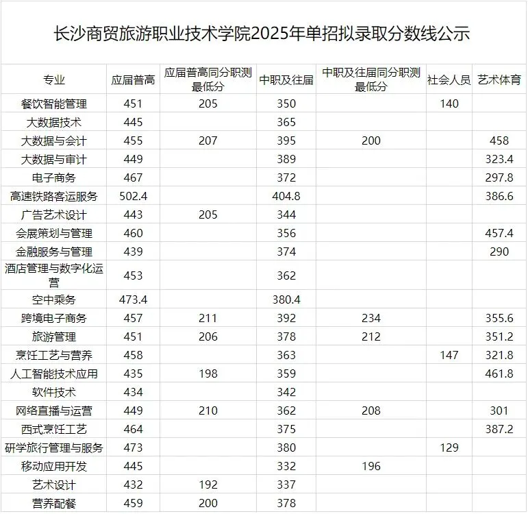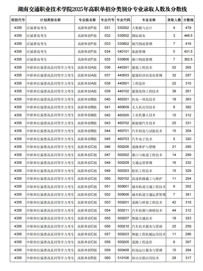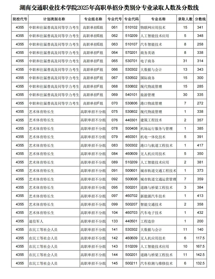 根据湖南省教育厅、省教育考试院有关文件要求和《湖南高速铁路职业技术学院2025年单招章程》的相关规定,经学院招生工作领导小组审定,并报湖南省教育考试院审核通过。现对我院2025年单独招生第一志愿各类别录取合格标准线、录取分数线、递补录取分数线等向社会进行公示: