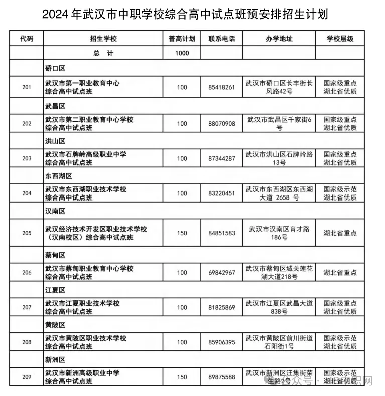武汉一职、武汉二职、石牌岭高级中学、东西湖职业技术学校、武汉经开职业技术学校、武汉蔡甸职业技术学校、武汉江夏职业技术学校、武汉黄陂职业技术学校、武汉新洲高级职业中学。高中试点班录取分数线475分,仅低于普通高中,和普通高中一样学习的也是纯文化课,大文大理,能够参加普通高考。