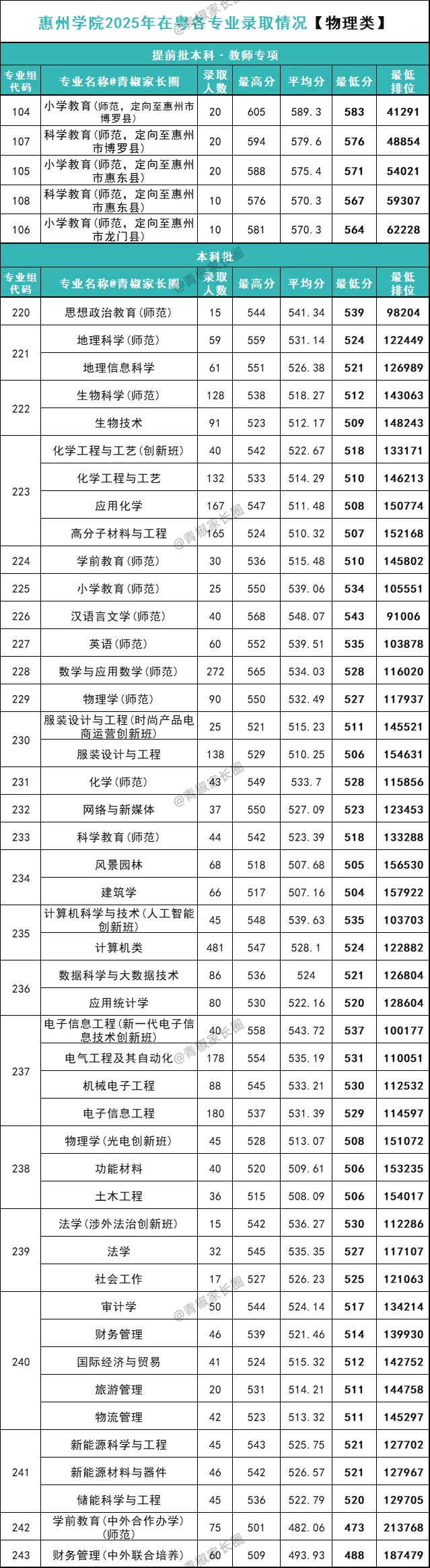 提前批本科·教师专项中,有小学教育(师范)、科学教育(师范)2个专业,录取分最高是定向至博罗县的小学教育(师范),需583分/41291名,该专业去年已位居全校录取难度榜首,今年再度提升4235名,也录到了学校在物理类的广东最高分(605分/22905名)。最低是定向至龙门县的小学教育(师范),需564分/62228名,超特控线30分。