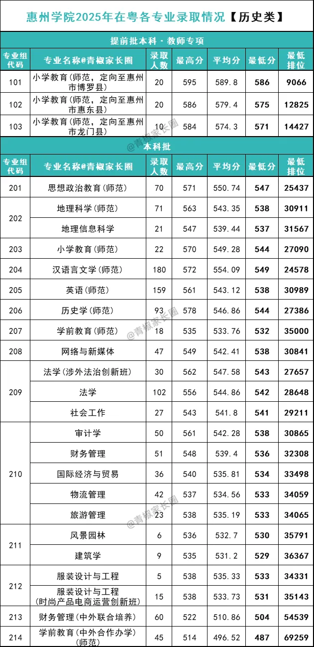 提前批本科·教师专项中,仅小学教育(师范)1个专业,录取分最高定向的是博罗县,需586分/9066名,也录到了学校在历史类的广东最高分(595分/6276名);最低定向的是龙门县,需571分/14427名,比特控线高了14分。