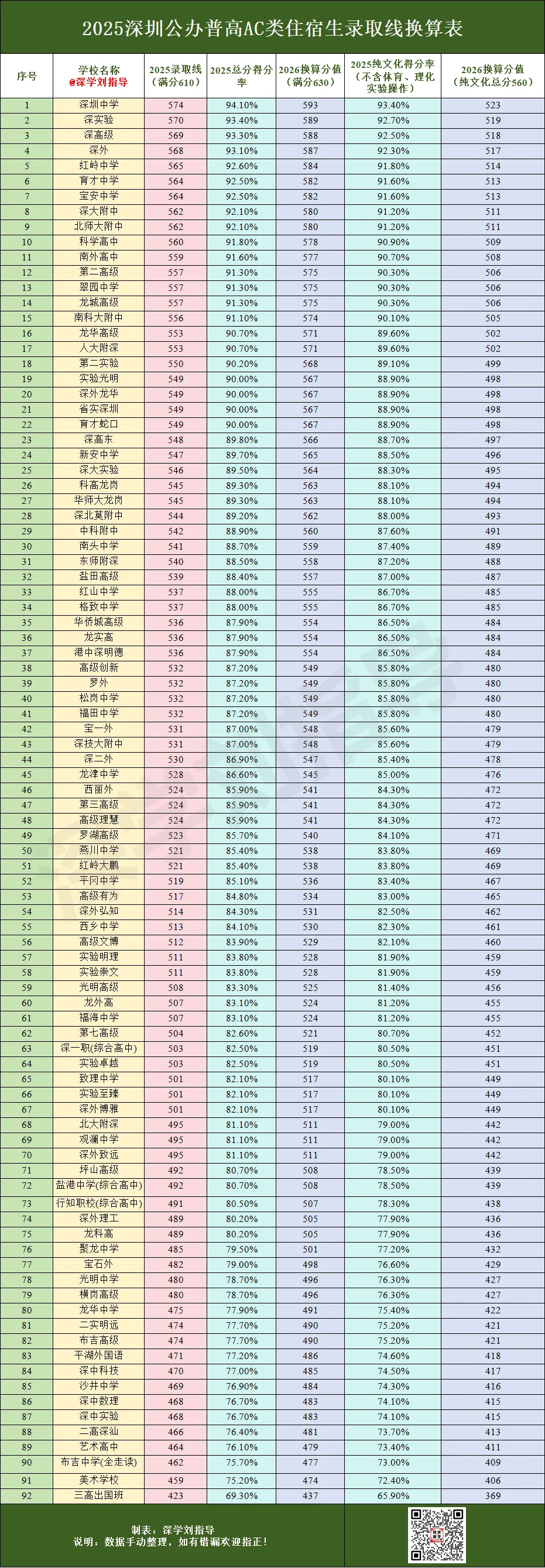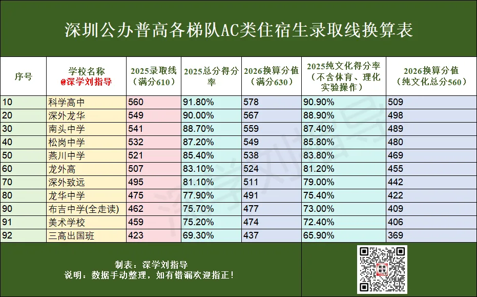 尽管近年深圳中考录取分数线受试题难度、考生人数等因素影响略有波动,但从深圳教育考试院发布的2022-2025年中考录取排名数据来看,公办高中的梯队排名(尤其是头部高中)整体保持稳定,因此往届录取的得分率与排位数据,仍是2026届初三家长择校定位的关键参考。