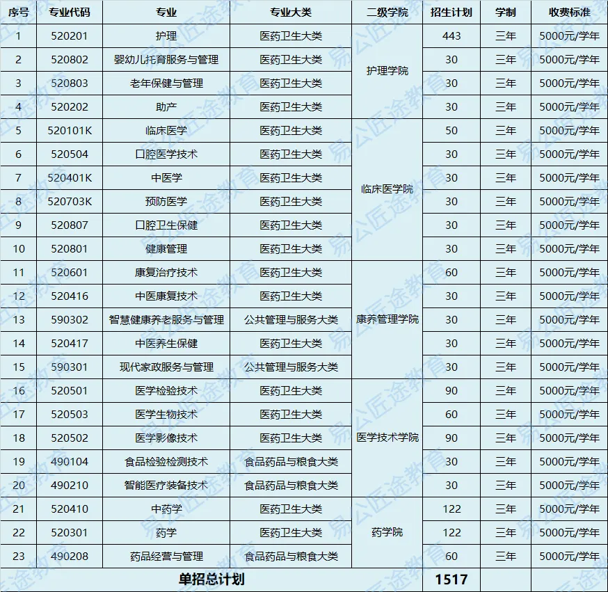 2024年单独招生专业23个,总计划招生数为1517人。未公布报考人数,共设置203个考场,估算约共6000人左右报考,录取比例约为25%。具体招生计划如下: