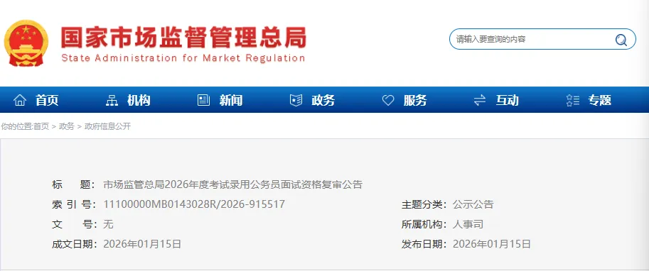 标题:市场监管总局2026年度考试录用公务员面试资格复审公告