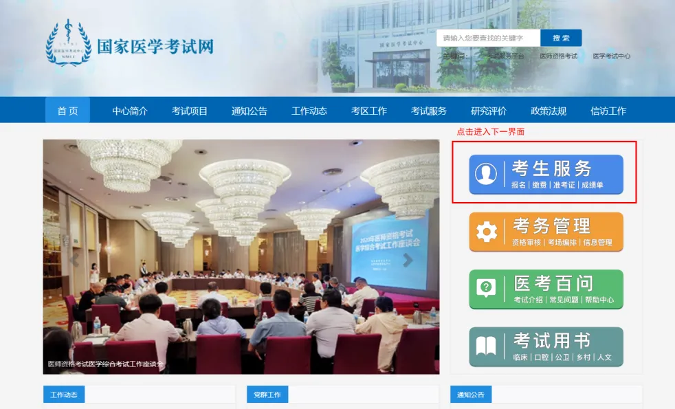 在电脑端打开国家医学考试中心网站:http://www.nmec.org.cn 点击官网右侧考生服务进行进入官网报名登录界面。