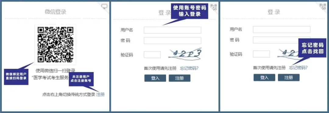 方式1:微信扫码登录,该功能需要考生本人绑定微信号。首次使用时须与考生服务系统登录账号和密码进行绑定(一个微信号只能绑定一个账号),绑定成功后即可实现扫描一键登录系统。同时该系统仍保留原账号和密码的登录方式。