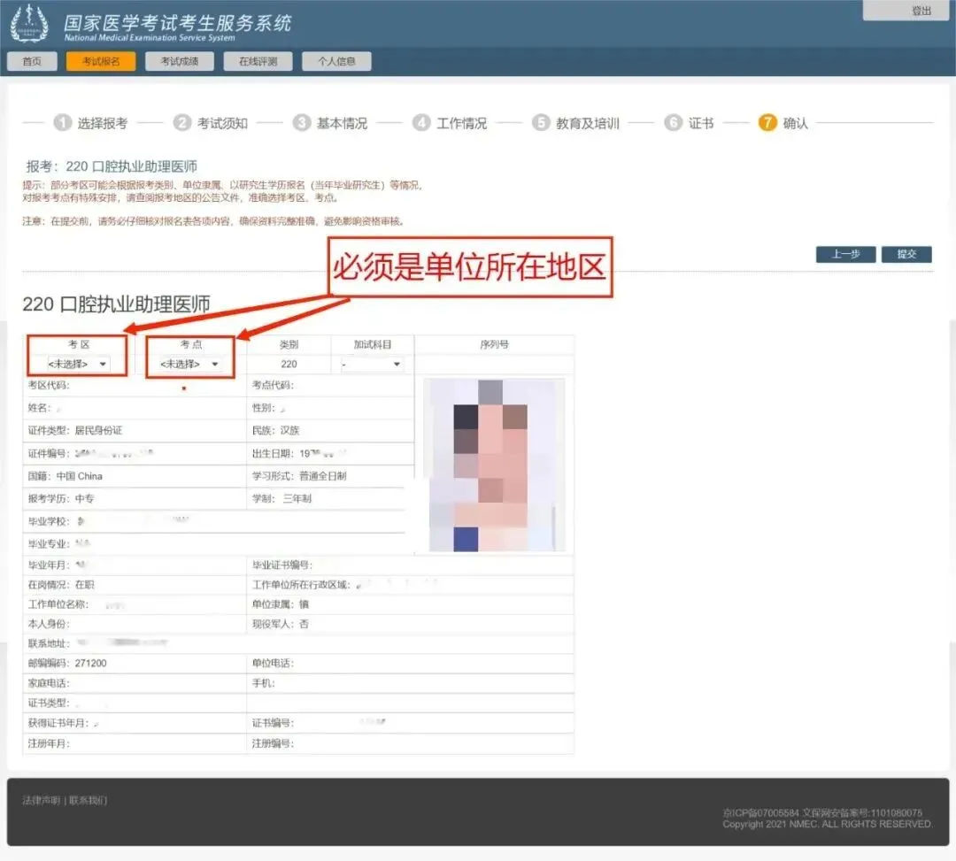 选择好后,下方显示的是刚才填写的全部信息,在现场确认成功,并签字后,不再受理个人报名信息修改,所以请再次核对并确认所有信息是否填写无误,确认无误后点击提交按钮。