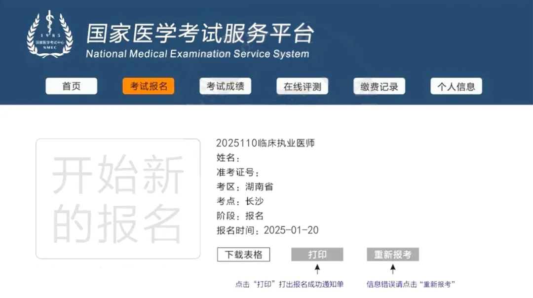 此时页面跳转到考试报名界面,点击打印按钮,打印《医师资格考试网上报名成功通知单》