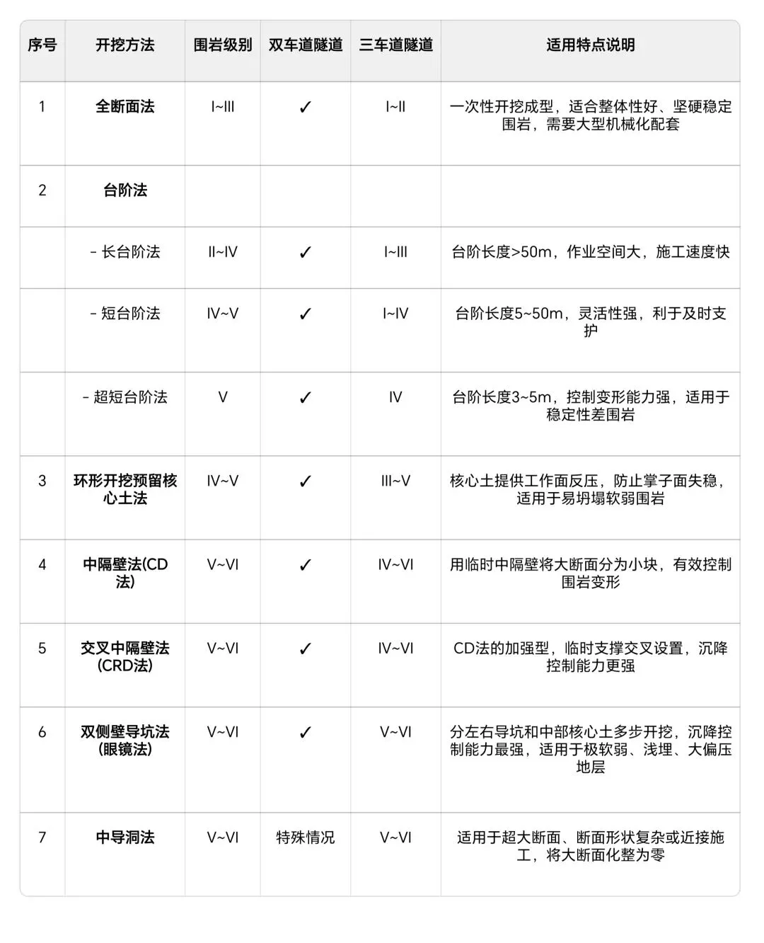 7.2.1条应根据地质条件、隧道开挖断面和围岩稳定情况选择开挖方法。不同围岩条件和开挖断面适宜的开挖方法见表(双车道隧道Ⅰ-Ⅲ级围岩可选全断面法开挖,双车通隧道Ⅲ-Ⅳ级围岩可选长台阶法开挖。)