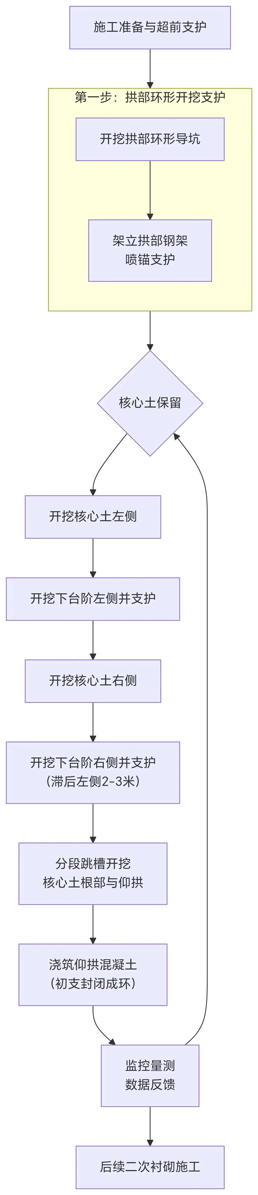 (5)各台阶留核心土开挖每循环进尺宜与其他分部循环进尺相一致。