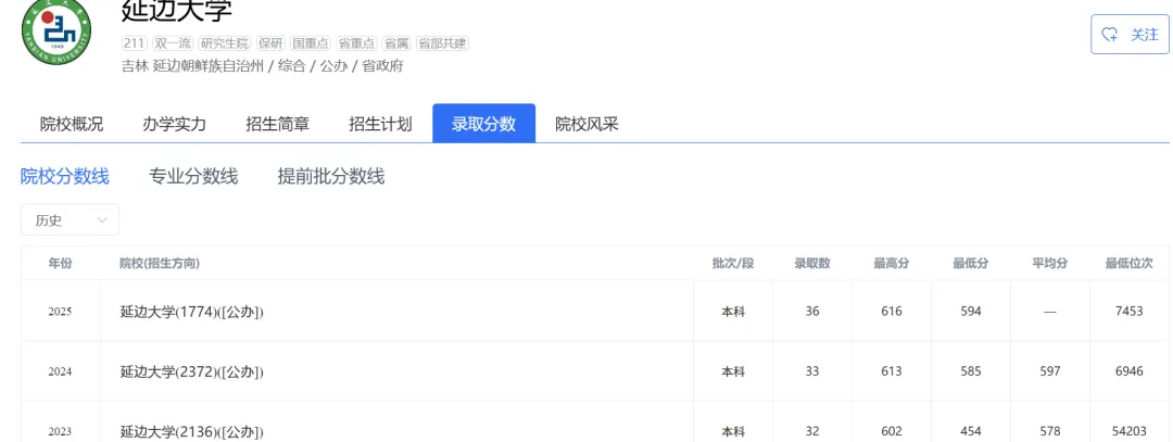 2026年高考志愿填报指南:延边大学2025年在河北省物理、历史类各专业组最低录取分数线及位次排名是多少?冀考一点通李老师提醒考生家长:在参考分数时最少要看近三年的数据位次排名进行对比,以下是该院校的具体分数: