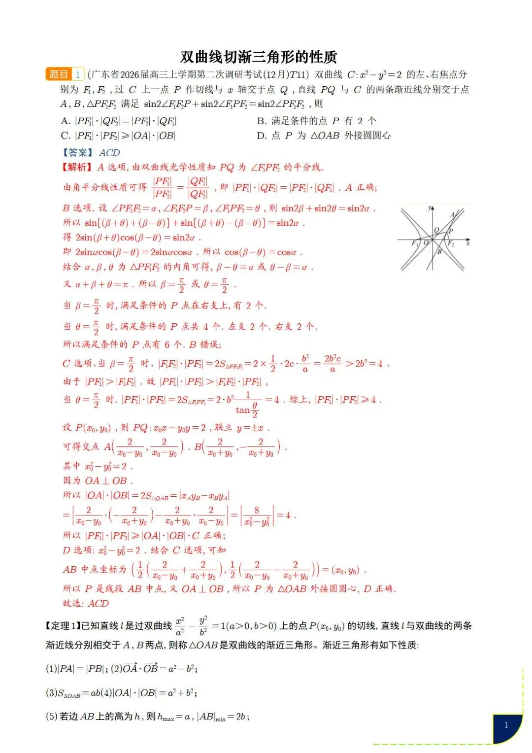 广东省2026届高三上学期第二次调研考试(12月)T11双曲线切渐三角形的性质