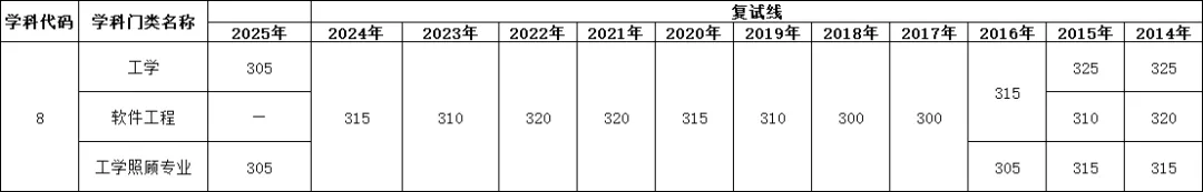 分析:25考研复试线相比于24考研降了10分,近几年的复试线都在305-320分左右浮动,报考难度不大。