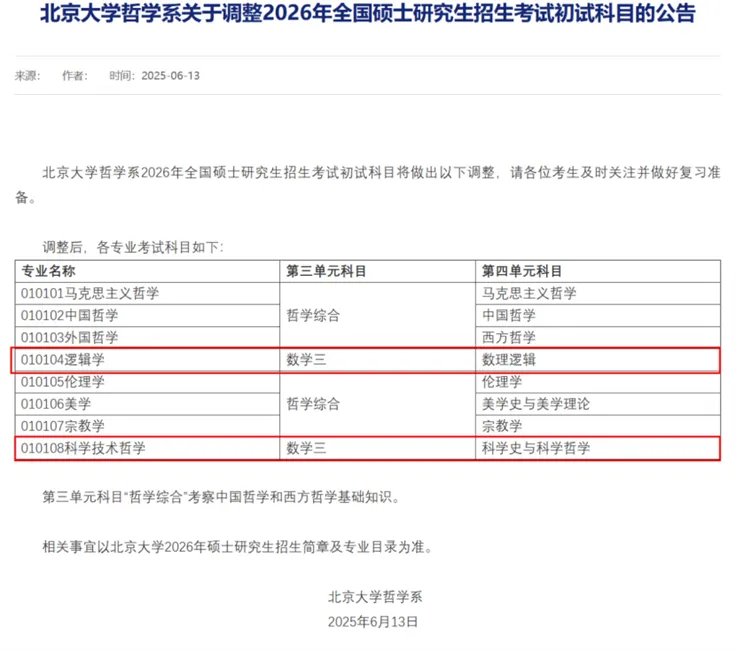 2026年已有多所高校官宣调整:北大哲学系的逻辑学、科学技术哲学专业,西北农林科技大学公共管理学专业,都新增了数学相关考试科目。不只是顶尖院校,北京师范大学、山东大学等也在部分文理交叉专业中加入了数学能力考察。