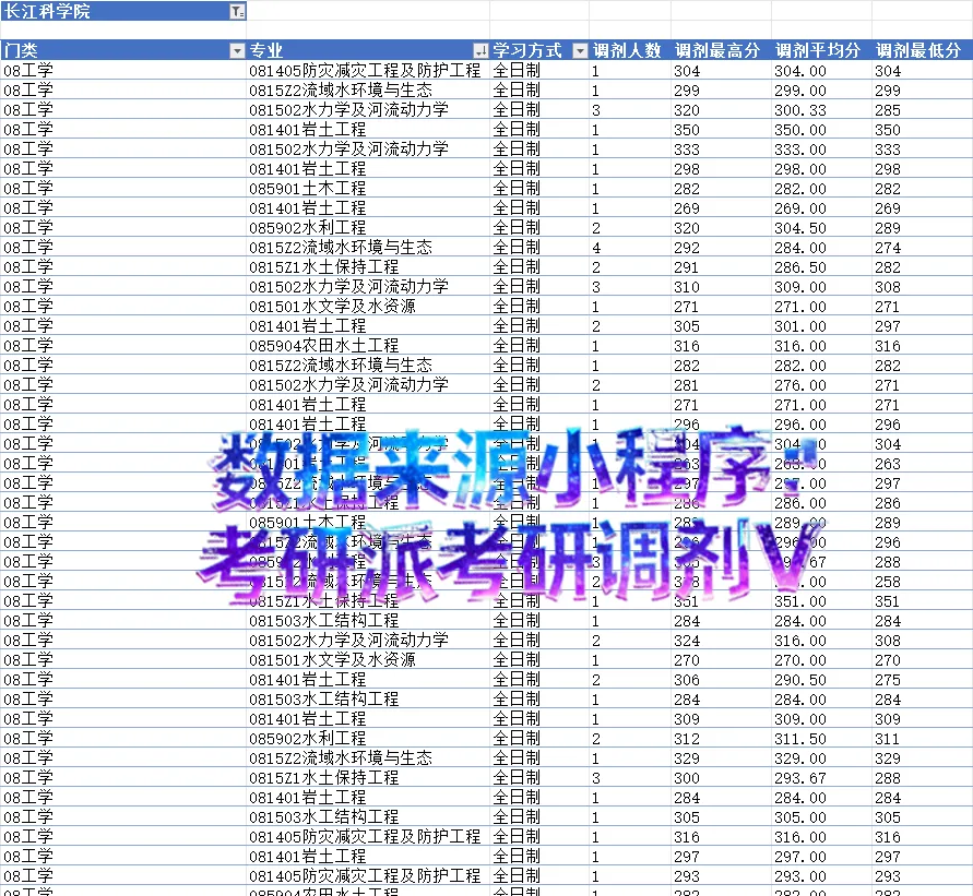 从整体数据来看,长江科学院调剂门槛适中,分数集中在 290-310 分区间,对中等分数段的工学考生十分友好。