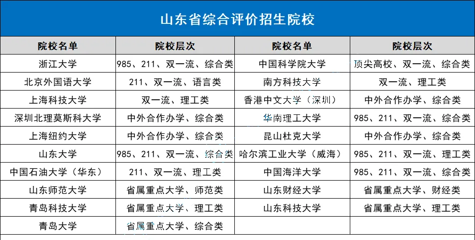 此外,还有10所省外高校在山东进行了综合评价招生,分别是:北京外国语大学、中国科学院大学、南方科技大学、上海纽约大学、昆山杜克大学、深圳北理莫斯科大学、香港中文大学(深圳)、上海科技大学、浙江大学、华南理工大学。