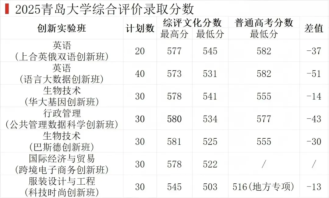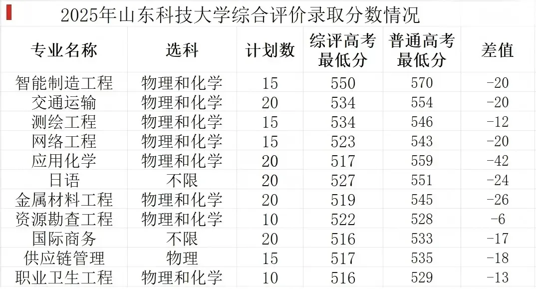近几年来,山东大学综合评价招生的降分幅度呈现出持续下降的趋势,从前些年的降分20分,逐步调整至今年大致在上下10分的区间。具体来看,2025年降分情况中,预防医学专业降分达17分,经济学类与材料类专业的降分幅度则分别为11分,其余专业的降分基本都控制在10分以内。山东大学所采用的分组招生模式具备较高的科学性,同时,其综合评价招生的生源质量也呈现出稳步提升的良好态势。山东大学在招生专业的设置上展现出了十足的诚意,文科里面汉语言、法学、经济学、历史学。理科里面的材料、机械、能源、计算机、网络安全、临床都是目前的大热专业,同时大多数也是山大的头部专业。青岛科技大学综合评价招生的所有专业,均设置在普通类常规批次当中。从专业布局来看,无论是要求选考物理和化学的理科类专业,还是选考科目不限的文科类专业,都有一些颇具优势、值得关注的专业。在青岛科技大学的综合评价招生中,降分幅度最为显著的是两个重工科专业,其中金属材料专业降分达38分,功能材料专业降分31分。从青科的学科实力来看,其国家特色专业与省级特色专业大多集中在重工科领域,像化学工程、高分子材料与工程、材料物理、过程装备与控制工程等专业均在其列。因此,在一定程度上,高分子材料专业、过程装备专业以及化学专业,考生以510 - 520分的成绩就能被录取,性价比相当高。此外,该校的几个文科专业降分情况也较为可观,英语、工商管理、财务管理、编辑出版学等专业均有20分左右的降分。整体而言,该校各专业的降分幅度较为平稳且合理。汉语言文学、中国共产党历史、工商管理这三个专业,以及三个中外合作办学专业,均可被视为热门专业。此次山东师范大学综合评价招生的降分幅度较为平稳,平均降分约23分。该校的三个中外合作办学专业未在普通类批次招生,不过从相关数据来看,山东师范大学的财务管理(中外合作)专业录取分数为545分,物流管理(中外合作)专业录取分数为522分,这两个专业的分数均远高于其综合评价的录取分数,通过综合评价报考这两个专业,可实现约20分的降分。在热门专业中,汉语言文学专业的降分表现十分突出,取得了19分的降分。需要提醒考生和家长的是,新闻学专业虽然看似降分幅度较大,但它实际上属于“艺术类”专业,只有播音主持艺术统考成绩达到本科线的考生才有资格报考。