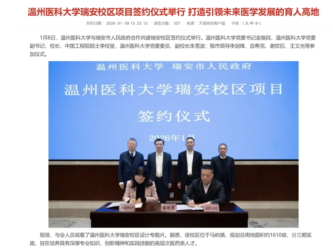近期温州医科大学与瑞安市人民政府合作共建瑞安校区的签约消息,无疑为医药类人才培养开辟了新赛道。这所规划总用地面积约 1610 亩的新校区,分三期实施,以研究生教育为核心,将成为孩子未来深造的优质选择。