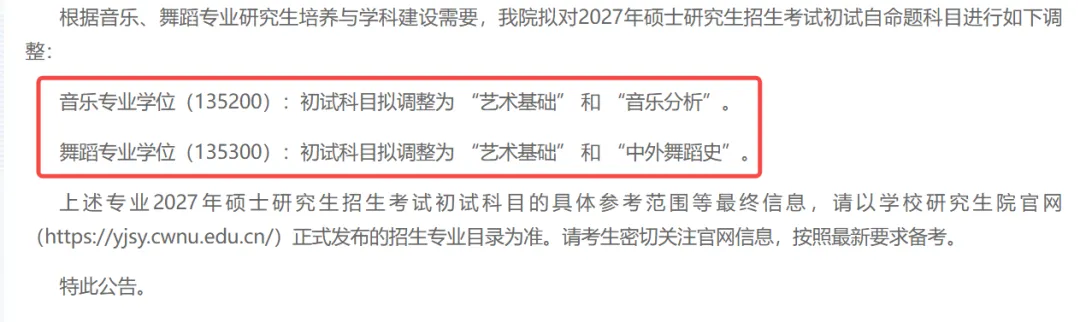 西华大学发布了关于2027年音乐、舞蹈专业学位硕士研究生入学考试初试科目调整的公告。