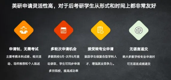 ✅升学更灵活,容错率拉满:不同于国内考研“一考定终身”的模式,留学采用申请制,可同步投递多所院校,凭借滚动录取机制大幅提升上岸成功率。跨专业申请通道畅通,商科更是热门转专业方向,满足不同学子的职业规划需求。更贴心的是,英国多数院校支持无语言成绩先拿有条件offer,考研后集中补递语言成绩即可,完美衔接时间线,无需浪费额外备考周期。
