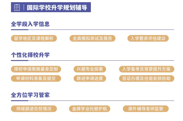 我们致力于为4-16岁的孩子提供全球范围内的择校升学规划、学业规划及管理服务。我们深度剖析主流英语授课国家及地区的课程体系、教学风格、录取机制及入学要求,并拥有独到见解。结合学生的个性化需求,为学生及其家庭提供全面、定制化的升学规划方案与全学段入学信息咨询服务。