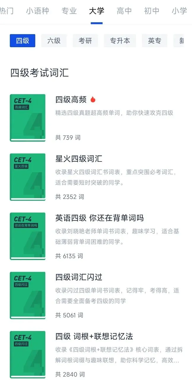 ,一次可以背好多个(根据个人情况而定),把初中单词过一遍,你就都想起来了(以前是祖国花朵的时候被灌溉过~)。背初中单词不会花费你太多时间,到中期你就背高中英语词汇,因为你背完了初中单词,高中单词比初中单词多一点,但是此时此刻的你也有了部分基础。背完初中和高中词汇的你,基础有所小成!后期可以再背去4/6级词汇,也可以直接去背考研单词,你之前在其他单词本背过的,再你重新选择其他单词书的时候也会提示你有多少单词你背过,一步一步来,每一步都算数!