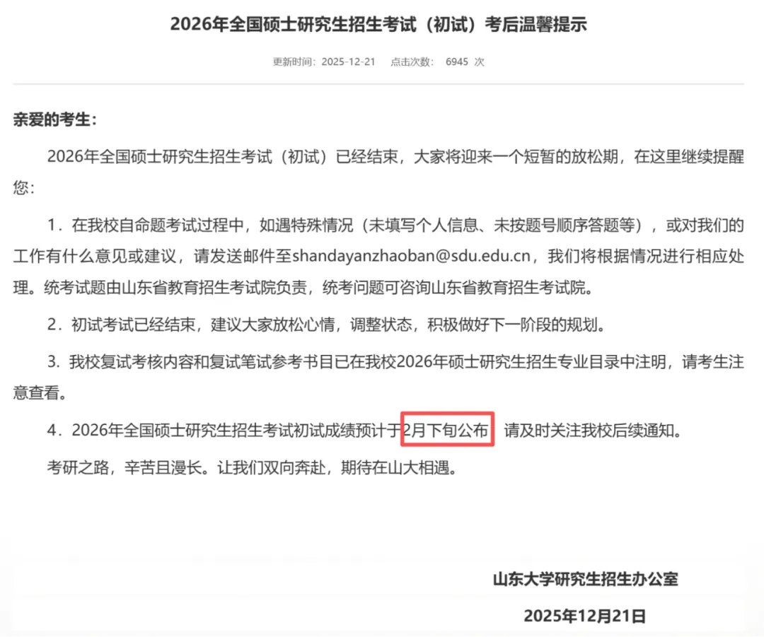 山东大学:2026年全国硕士研究生招生考试初试成绩预计于2月下旬公布,请及时关注我校后续通知。