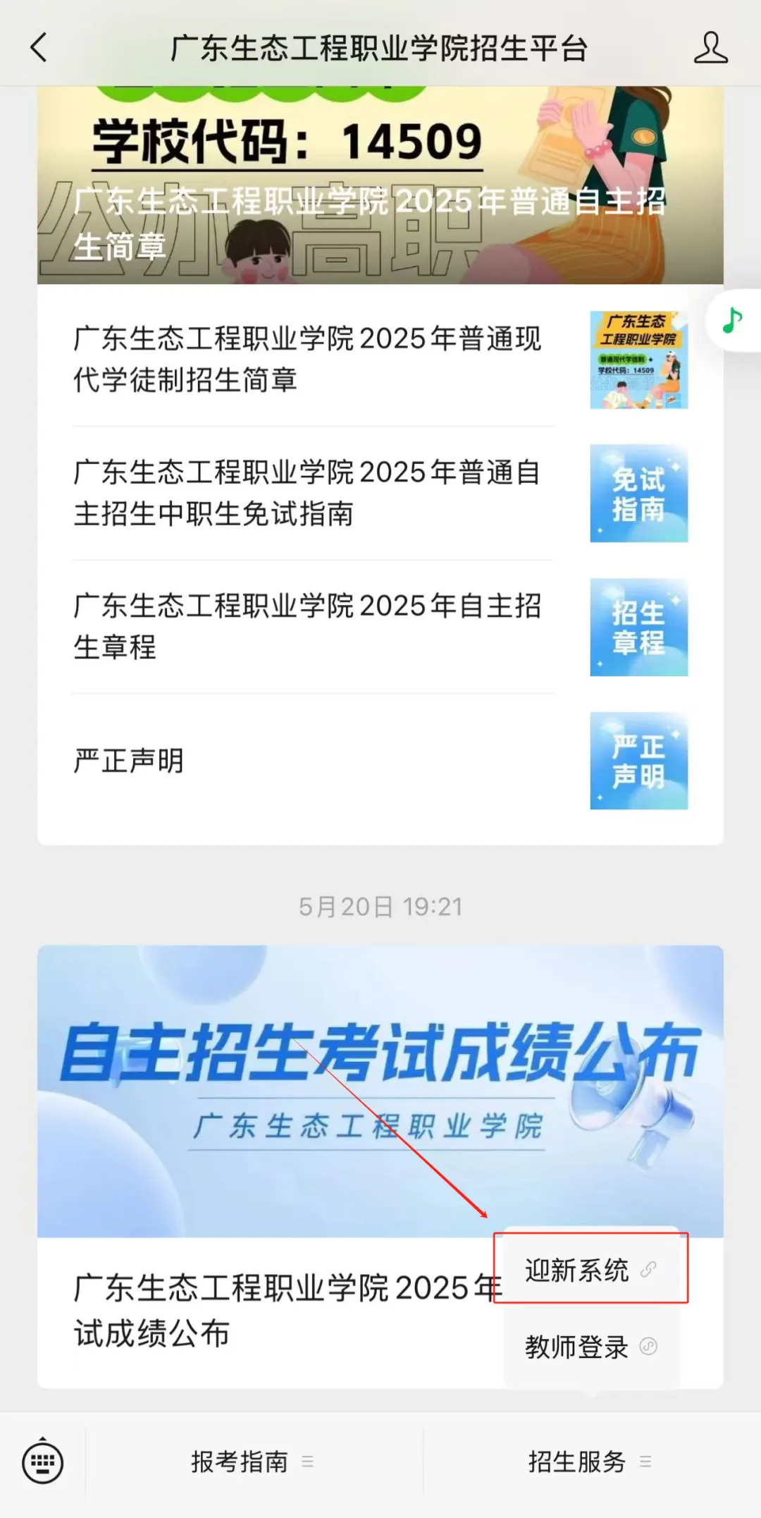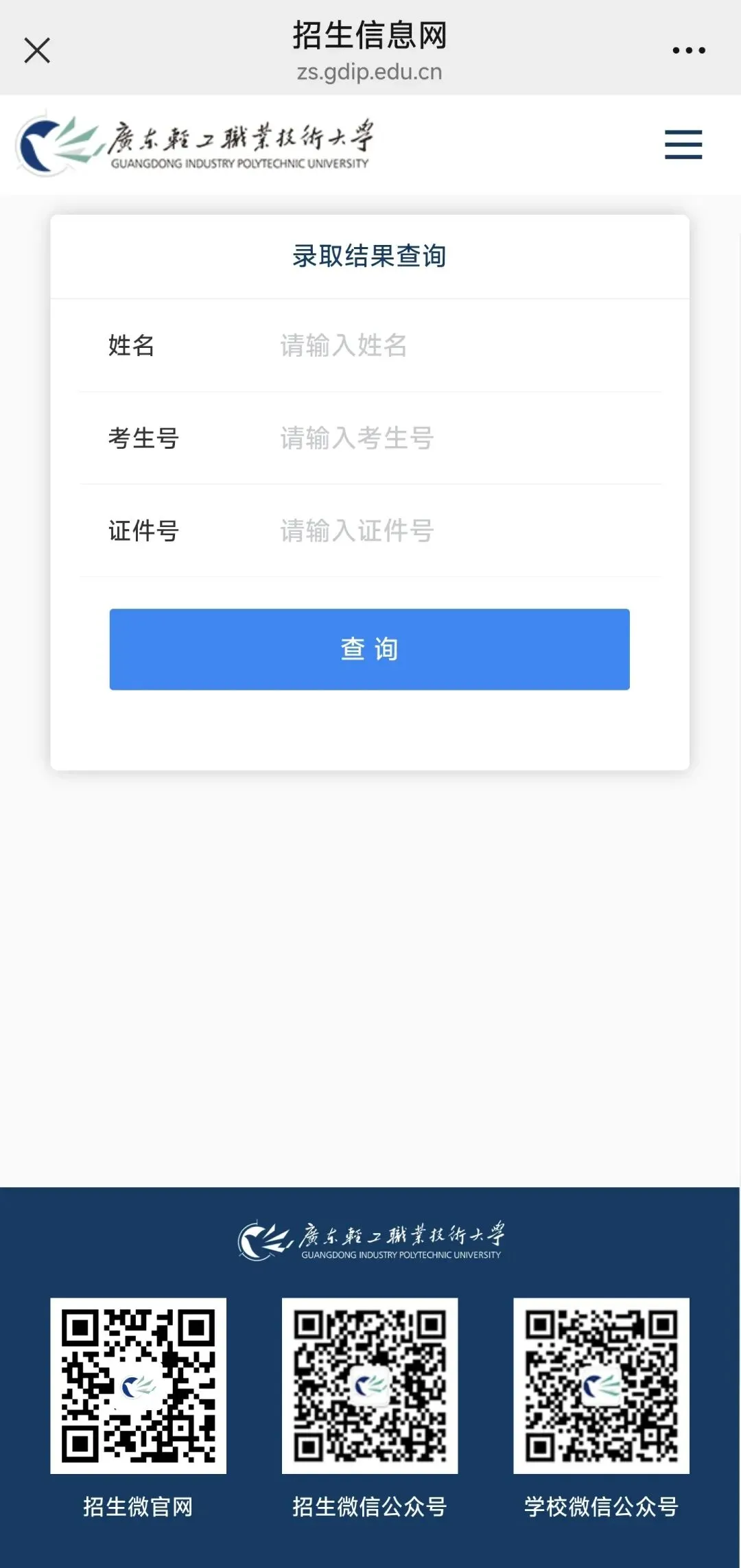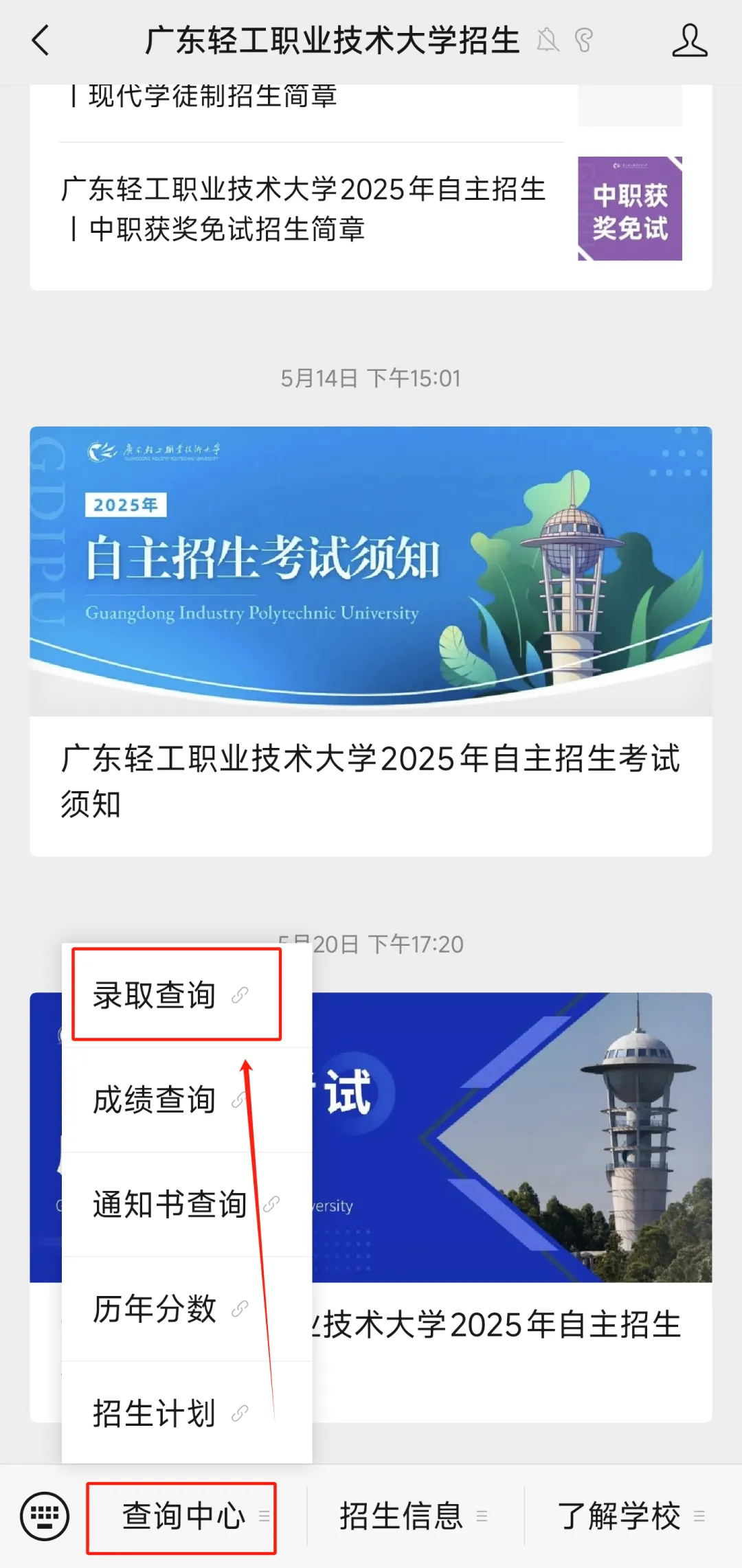关注“广东轻工职业技术大学招生”微信公众号,在页面底部选择“查询中心”,按栏目指引即可查询录取结果,如下图所示: