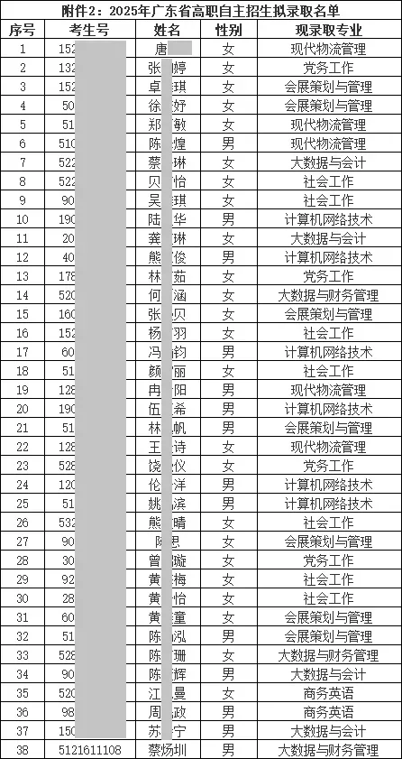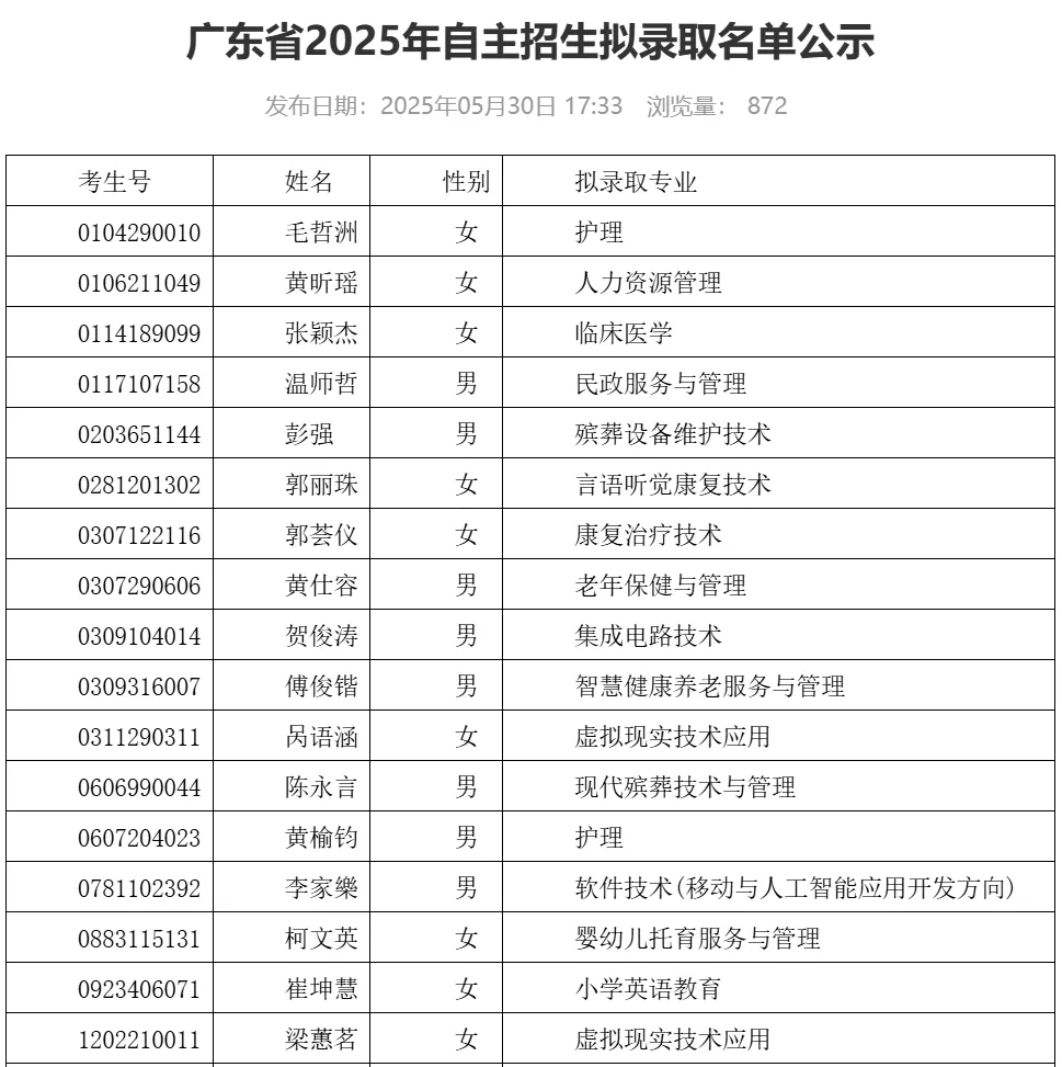 经考生报名,我校审核,共11名符合自主招生章程和简章要求,公示无异议,报广东省招生办公室审核并备案通过,请考生自行查询录取结果。