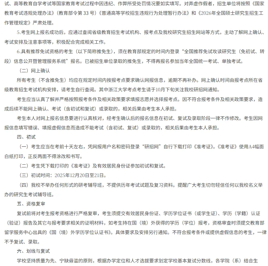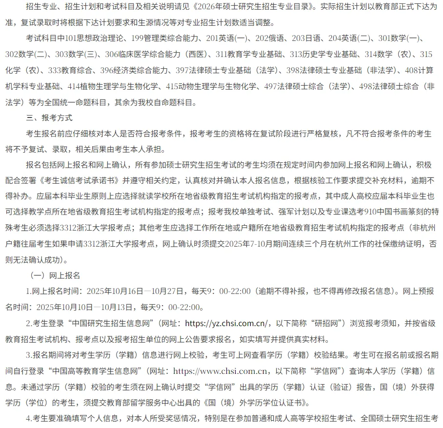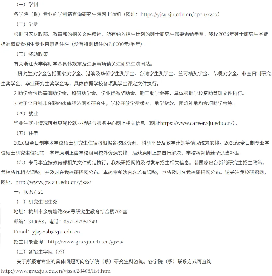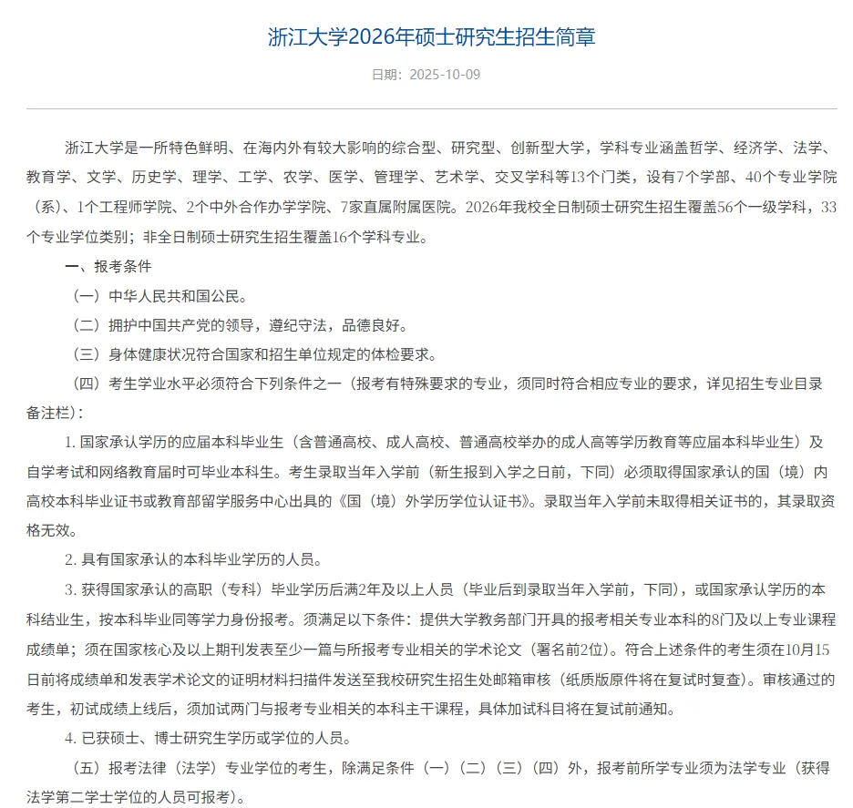 浙江大学是一所特色鲜明、在海内外有较大影响的综合型、研究型、创新型大学,学科专业涵盖哲学、经济学、法学、教育学、文学、历史学、理学、工学、农学、医学、管理学、艺术学、交叉学科等13个门类,设有7个学部、40个专业学院(系)、1个工程师学院、2个中外合作办学学院、7家直属附属医院。2026年我校全日制硕士研究生招生覆盖56个一级学科,33个专业学位类别;非全日制硕士研究生招生覆盖16个学科专业。