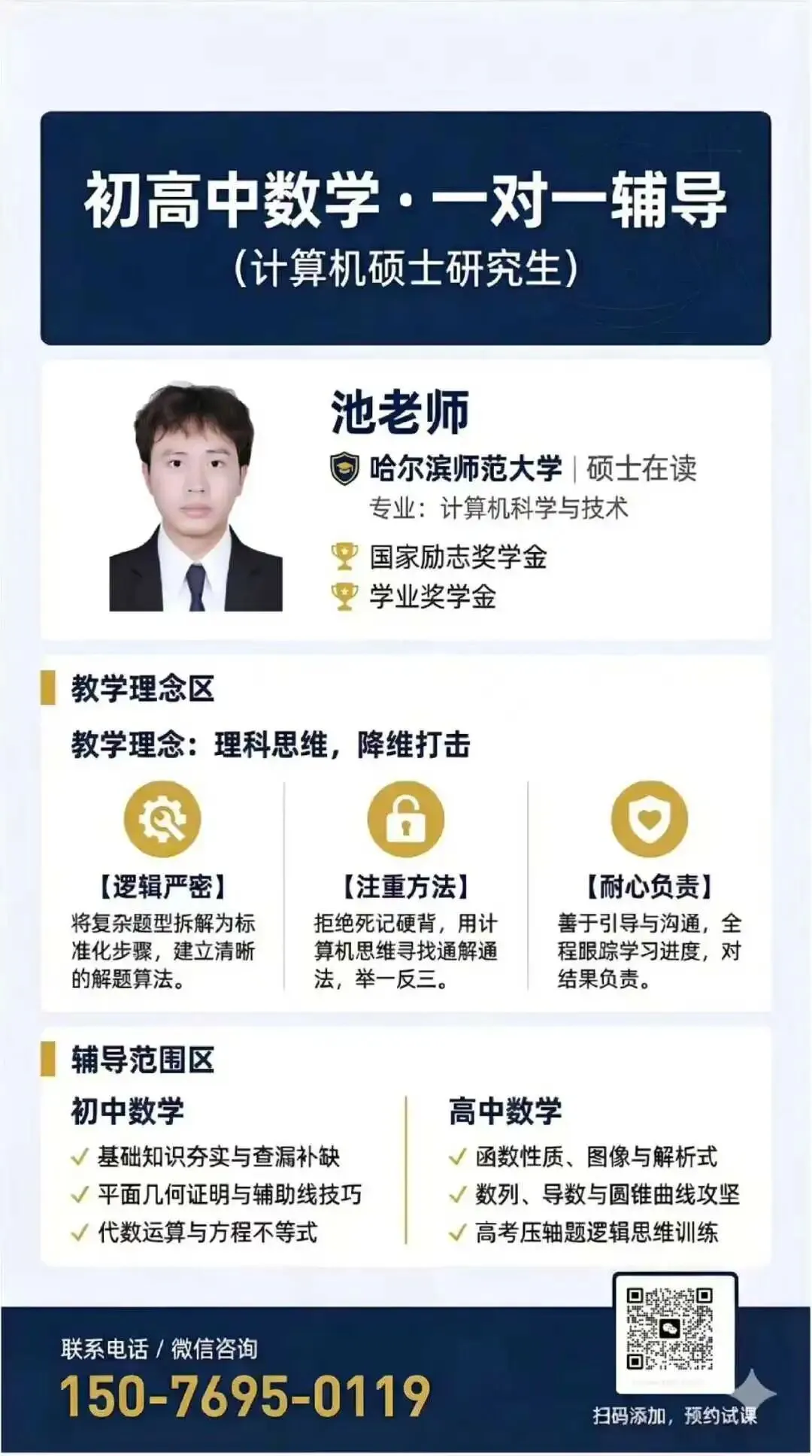 该研究生拥有超高的理科思维,善于用“高维”视角剖析初高中数学问题,实现精准降维打击。能将数学思想转化为生动易懂的讲解,快速打通学生知识卡点。