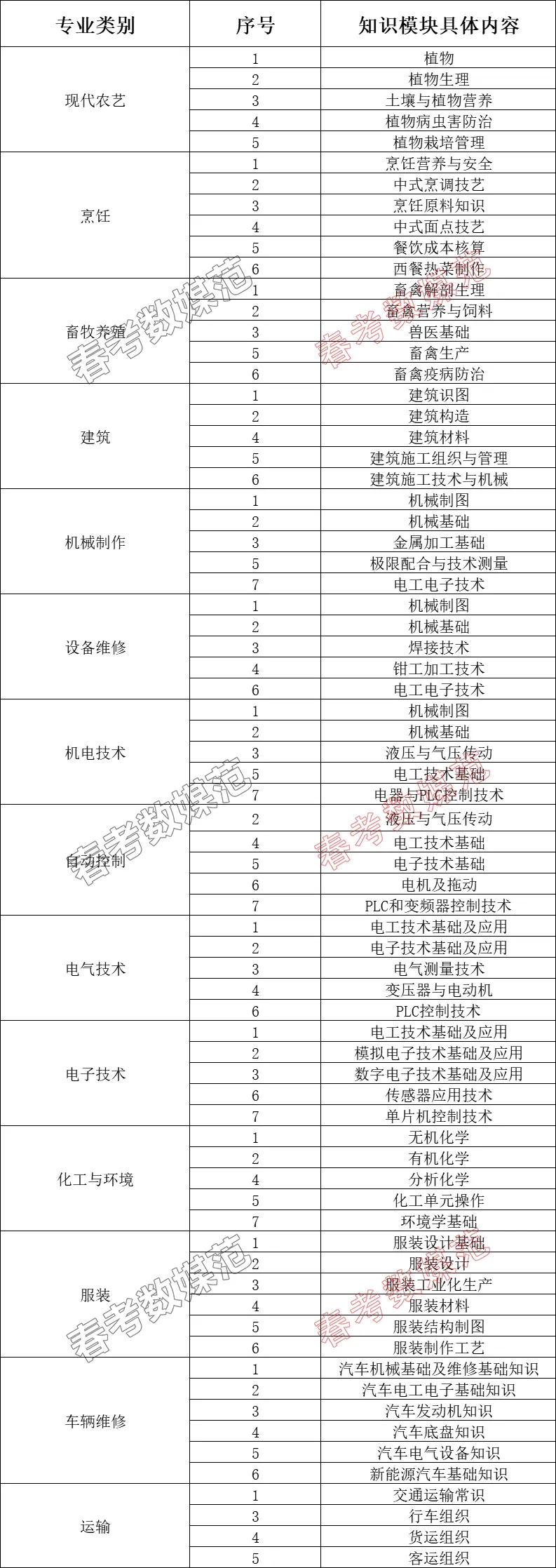 >春考各专业理论知识具体考试模块内容