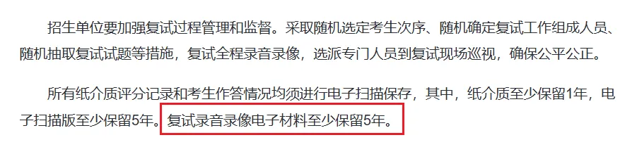 2026年研招规定,复试录音录像电子材料至少保留5年。